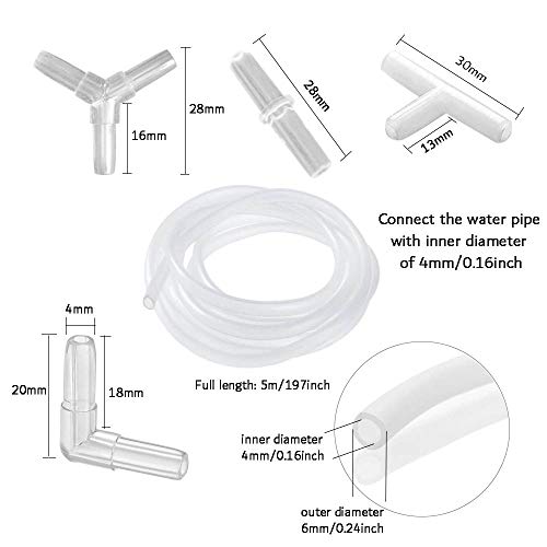 48 in 1 Aquarium Airline Connectors + 5M Airline Tube: The pack contains 12 x Y Aquarium connector; 12 x T Aquarium connector; 12 x L Aquarium connector; 12 x I Aquarium connector, 5M 4mm x 6mm (inner x outer)diameter Fish Pond Air Line Tube Pipe. Airline tubing 5M/197 inch length is convenient for you to cut based on your required length. Great accessories for your fish tank tube, air pump, check valve, bubble stone connection.