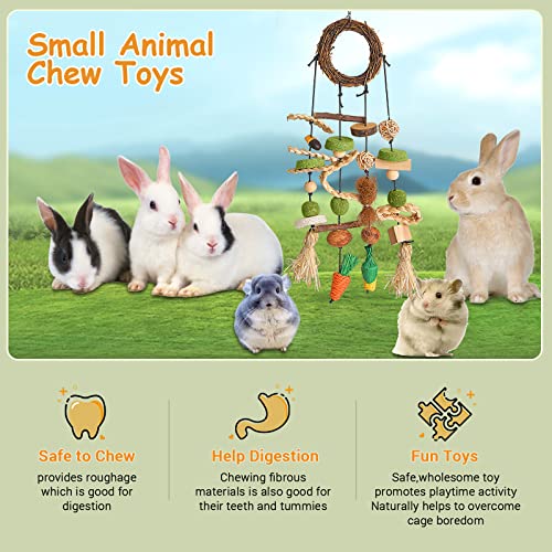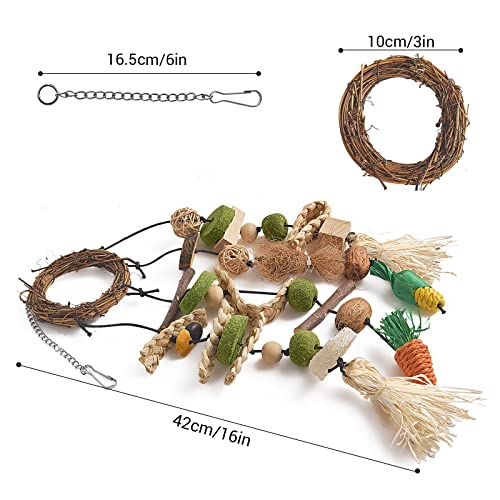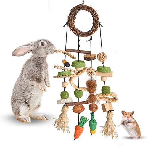 Bunny Toys for Rabbits:The rabbit toys includes grapevine wreaths,timothy hay cakes,rattan,loofah Slice,grass carrot,nut,corn Husk.Suitable for bunny,chinchillas,hamsters,guinea pigs,gerbils,rats,and other small pets,also suit for all types of pet birds to peck and chew.