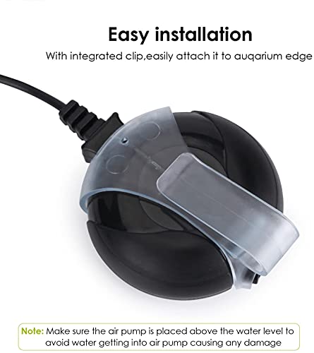 Small/Compact Oxygen Aquarium Air Pump -- Small size with diameter 60mm, height 18mm, come with a mount holder, you can easily clip it to the out edge of your fish tank without even notice. No struggle to sort out where to place it
