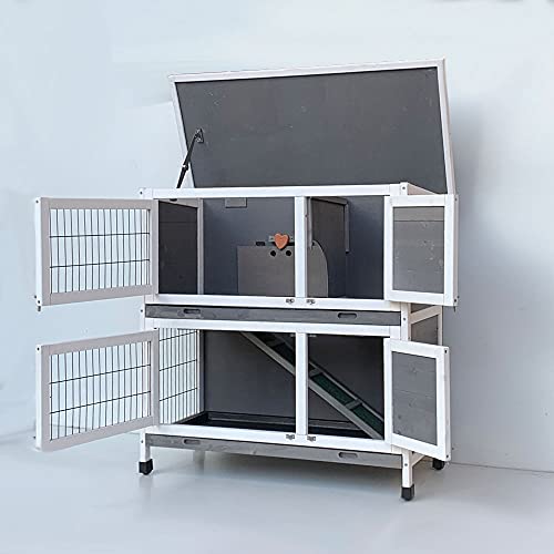 Rabbit hutch features two sliding plastic trays, Hinged opening roof, Both levels connected by a ramp, Locking barrel bolts.