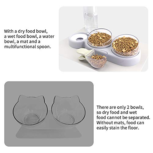 SIMPLE to USE: There are 2 bowls to separate dry and wet food. We have a food mat as a gift, so there is no need to worry about the food falling on the ground, and we will also give a clip to help customers seal the cat food.