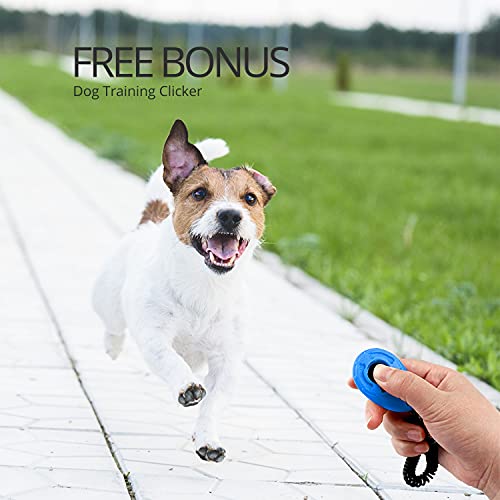 CFMOUR Retractable Dog Lead, 5m/20kg Blue Heavy-Duty Extendable Dog Leads for Small to Medium Dogs; Strong Nylon Tape Ribbon Leash, One-Button Brake&Lock, Bonus Training Clicker