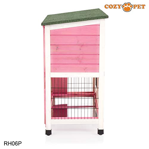COZY PET Rabbit Hutch RH06P. W 91.5 x D 45 x H 80 cm (W 36 x D 17.75 x H 31.5 inches); with 3 Sq Ft of play area. This item is designed for outdoor / indoor use and works perfectly with any Cozy Pet Rabbit Run and comes in our exclusive Cozy Pet Pink. The item is made from Fir Wood with an Asphalt Roof to keep pets cool in Summer and Warm in Winter. We now have a full range of Cozy Pet Hutch Covers, the 3ft RH06C cover fits this hutch. The item is supplied flat pack and can easily be assembled in about 30 minutes.