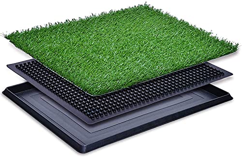 ????TRIPLE LAYER DESIGN - 3 Layer System - Synthetic grass mat+Elevated grid tray+Base collection tray. The urine will pass through the holes in the grid tray to the base collection tray.