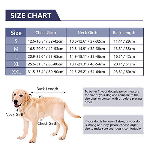 Sizes: There are 5 sizes available: S, M, L, XL, XXL. Please measure the circumference of the dog's neck, chest and back length in order to choose the correct size. It fits dogs of different sizes: small, medium, large, such as Teddy, Poodle, Bulldog, Labrador, Golden Retriever, etc. As this material is not stretchy, if your dog is strong and fat, you can go one size up to make sure your dog is comfortable.