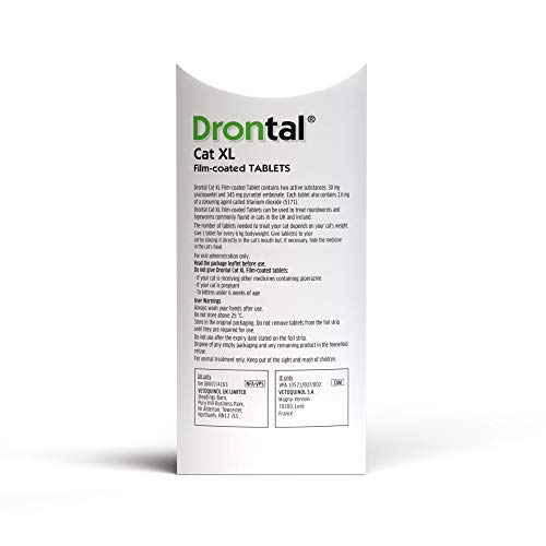 Drontal Cat XL Film-coated Worming Tablet 1 Tablet per 6kg of bodyweight kills all the common intestinal worms found in cats in the UK Treatment of gastrointestinal roundworms and tapeworms of cats. Routine control adult cats should be treated every 3 months