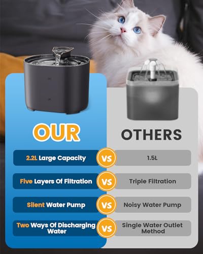 2.2L Large Capacity: Our 2.2L cat water fountain is designed for small to medium-sized pets, eliminating the need for frequent water refills. Whether you're busy with work, on a business trip, or traveling for 3-5 days, you can rest assured that your cat will have an ample water supply.
