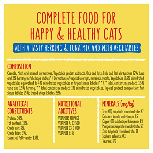Cereals, Meat and animal derivatives, Vegetable protein extracts, Oils and fats, Fish and fish derivatives (2% tuna and 2% herring in fish shape kibbles*), Derivatives of vegetable origin, minerals, yeasts, Vegetables (0.6% dehydrated vegetables equivalent to 4% rehydrated vegetables in tripod shape kibbles**), . *Total content in product: 1.5% tuna and 1.5% herring ** Total content in product: 1% rehydrated vegetables Typical product composition: fish shape kibbles 75%; tripod shape kibbles 25%.