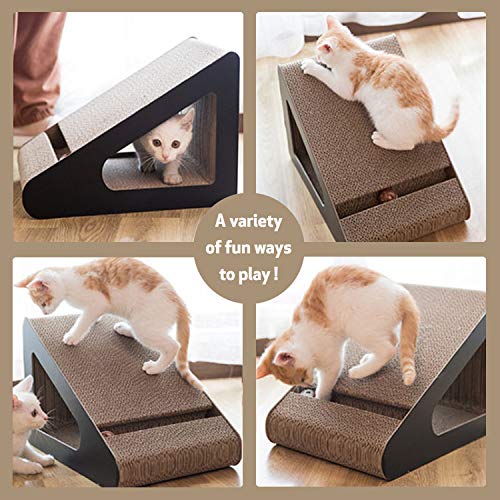 ?MULTIPLE WAYS TO PLAY?- Triangular design can provide several sides for cats to play. Based on cat's preference, inclined surface accommodates both uphill and downhill scratching and stretching, also features a cubby hole and ball toy for cats exploration and play.