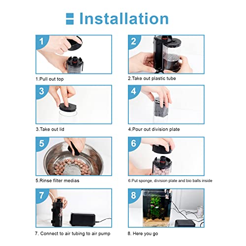 ?2-Stage Filtration System?The hygger Sponge Filter provides mechanical and chemical filtering to help keep water clear and your tank healthy. Fine sponge catches fish waste and tiny debris while that balls provide plenty space areas ensures proper oxygenation.
