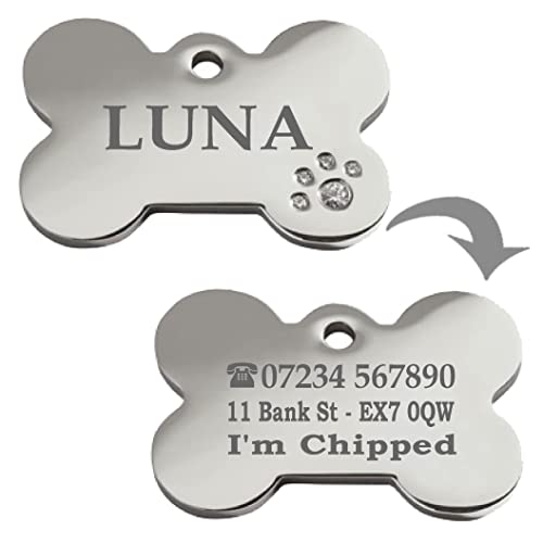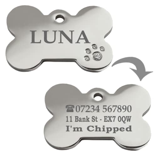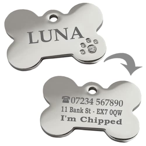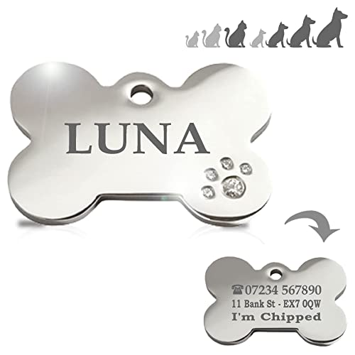 Iberiagifts - Bone ID Tag For Medium/Large Pets with rhinestones, For Dogs And Cats, Engraved And Personalised Identity Collar Plate