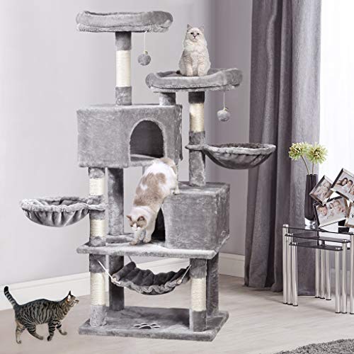 DURABLE CAT SCRATCHING TREE - Sturdy posts coiled with natural sisal rope keep your cats’ claws groomed and off your furniture; high quality particle boards make this cat tree an environment-friendly home furniture.
