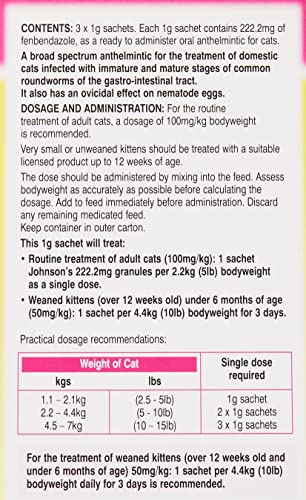 Use these Johnsons Easy Wormer Granules for your Cat or Kitten. These easy to use, odourless and tasteless Wormer Granules can be easily mixed into your feline friends food for an easy routine treatment of roundworms. Suitable for all cats and kittens from 6 months of age with a minimum weight of 1kg.