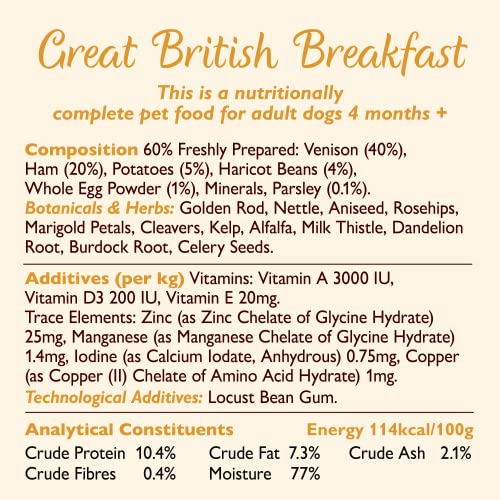 Multipack of nutritionally complete wet dog food - Coronation Chicken, Great British Breakfast and Sunday Lunch Nutritionally complete wet food for dogs 4 months + Made with freshly prepared meat, vegetables, fruits and herbs Made with proper meat - no meat meal, no bone meal, no rendered meat Natural ingredients with no added sugar or fillers