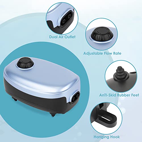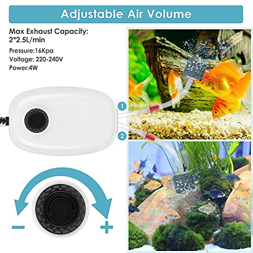 ????ADJUSTABLE & 2 OUTLETS --- This aquarium air pump can provide numerous oxygen for your fish tank with the double outlets; Power 4W, Pressure 16Kpa; A large number of bubbles can be released at the maximum flow rate of 2.5L/min with the adjustable flow rate; Ideal for fish tank wall, aquarium, small breeding pond under 64 gallons.