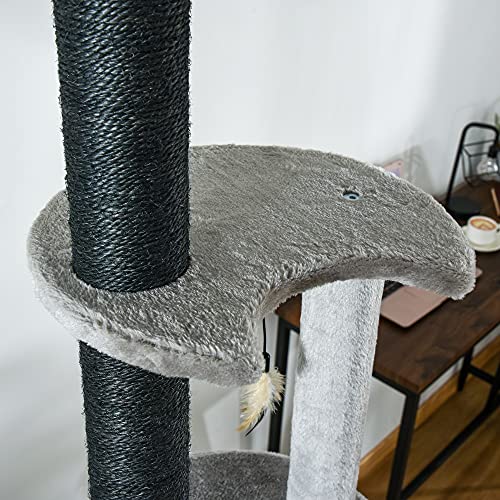 All in one activity center: Height adjusts between 225cm to 255cm, easy to fit securely in place. Gives your cat plenty of space to move up and down, keeping active and entertained all day long. The cat tower features two houses with multiple entrances, a middle house, various platforms, ladder, scratching posts, play ball on spring and feather.