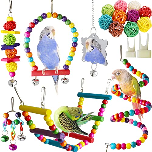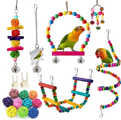 ??Multiple Birdcage Accessories?: The bird toys set consists of 12 pieces, 1 chewing toys, 1 hanging bells toys, 2 birds swings,1 mirror Toys, 2 bird fruit forks, 10 bird balls?1 rotating ladder.