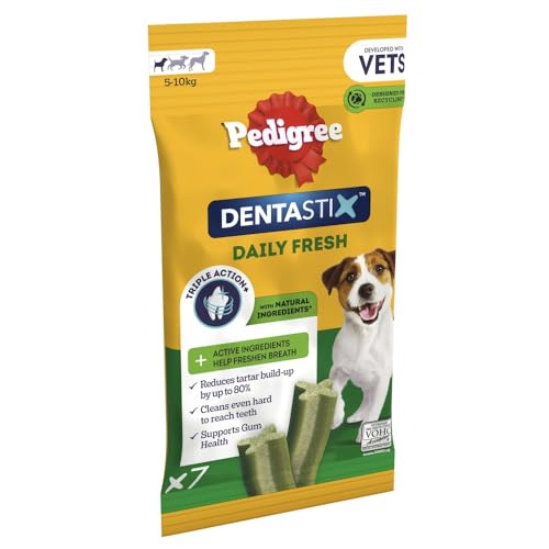 Triple action with Pedigree Dentastix Fresh: reduces tartar build-up by up to 80 percent, cleans hard to reach teeth, supports healthy gums and freshens breath