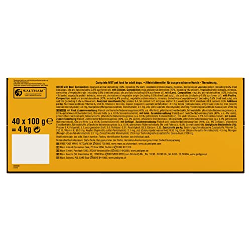 100% Complete and delicious wet dog food for adult dogs Easy-to-open pouches, perfect for a fresh healthy meal, on its own or on top of dry dog food Dog food developed with our vets and nutritionists at Waltham Pet Nutrition Centre This pet food contains no artificial colours, flavours or preservatives