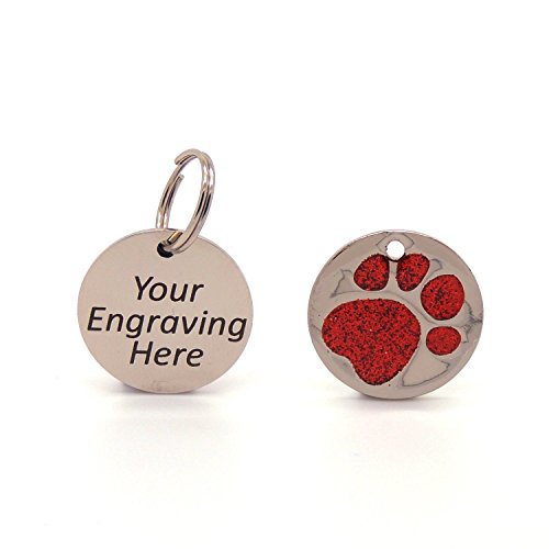 Personalised Engraved 25mm Glitter Paw Print Tag BOLD BLACK LETTERING Dog Cat Pet ID Tags (Red)