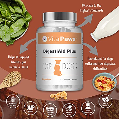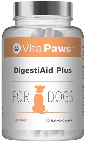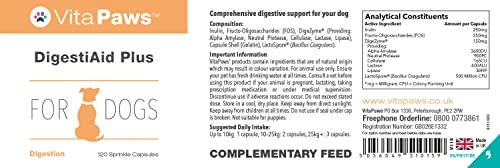 SUPPORTS A HEALTHY DIGESTIVE SYSTEM - VitaPaws DigestiAid Plus for Dogs combines probiotic and prebiotic factors to encourage the proper balance of the microflora of the dog's gut and support the overall health and of the gastrointestinal system. This product combines friendly bacteria with beneficial fibre, and also includes digestive enzymes for advanced and comprehensive digestive support.