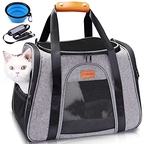 Material and size: This portable foldable cat bag is made of durable 600D polyester. At the same time, it is equipped with a support plate so that the pet bag can maintain a good shape. It is dark in color, resistant to dirt, and easy to clean. Our product size is 17.71*10.23*12.99 inches. It is recommended for pets under 15 pounds and approved by the airline. Before purchasing the product, please measure the size and weight of your pet