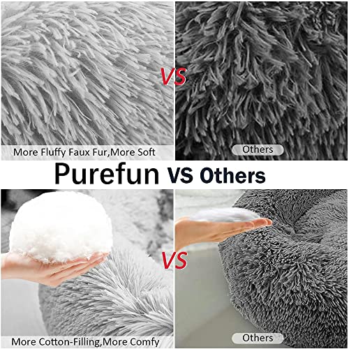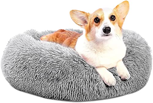 ????Unique Design: The fluffy plush round and pretty color appearance design make the pet bed are easier acceptable by dogs and cats. The donut dog bed pillow with raised rim creates a sense of security and provides head and neck support. The base of the round donut pet bed comes with non-skid silicone dotting to keep the bed from sliding for your pet's safety.