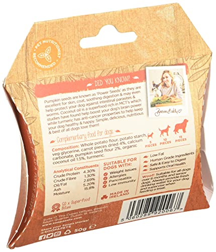 Pumpkin & Carrot Healthy Bites 50g, 100% natural Low in fat, calories & protein Hypoallergenic & pet nutritionist approved Help fight bad breath & aid digestion Winner of PPRA best pet product award