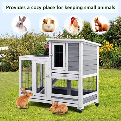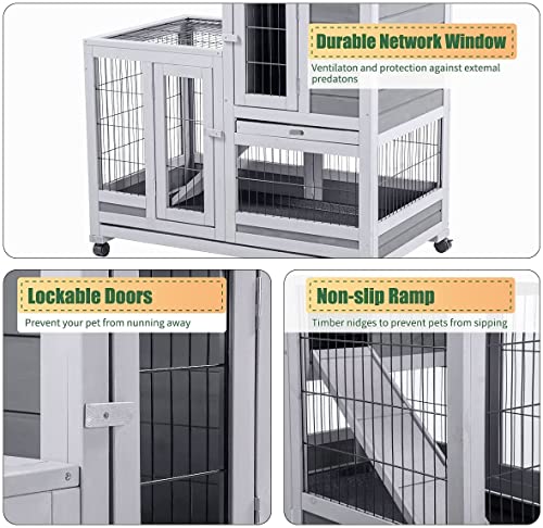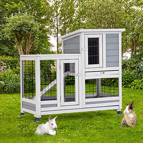 UNIONLINE 92cm Tall Wood Rabbit Hutch Indoor for Small Animals Double Decker Outdoor Guinea Pig Rabbit Cage with run, Pull Out Tray and Ramp