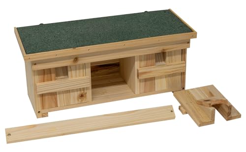 SPARROW HOUSE – A superb nesting box for birds such as sparrows and small garden birds which nest/breed in colonies providing shelter and protection. Small air holes are provided for ventilation WEATHER PROTECTED ROOF – Made from asphalt shingle the roof is weatherproof keeping the birds warm and dry even in poor conditions. The box itself is made from tough, durable fir wood EASY CLEANING – Each entrance can be removed for easy and thorough cleaning of the three nesting chambers (screwdriver required). An entrance can also be permanently removed to encourage larger birds to take up shelter EASY MOUNT – Two hanging brackets are provided for an easy mount onto a fence or wall. It is recommended to mount as high as possible for protection from ground predators (screws not included) SIZE - Overall size: L 47cm x D 19cm x H 22cm. Internal chamber size: 12.9cm x 14.5cm x 17cm. Entrance hole: 5cm x 3.5cm
