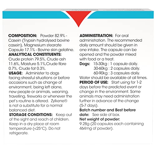 Zylkene (450mg) is a calming supplement for large dogs (30 to 60kg) to help them cope with challenging situations inside and outside the home such as fireworks and separation anxiety when left home alone.